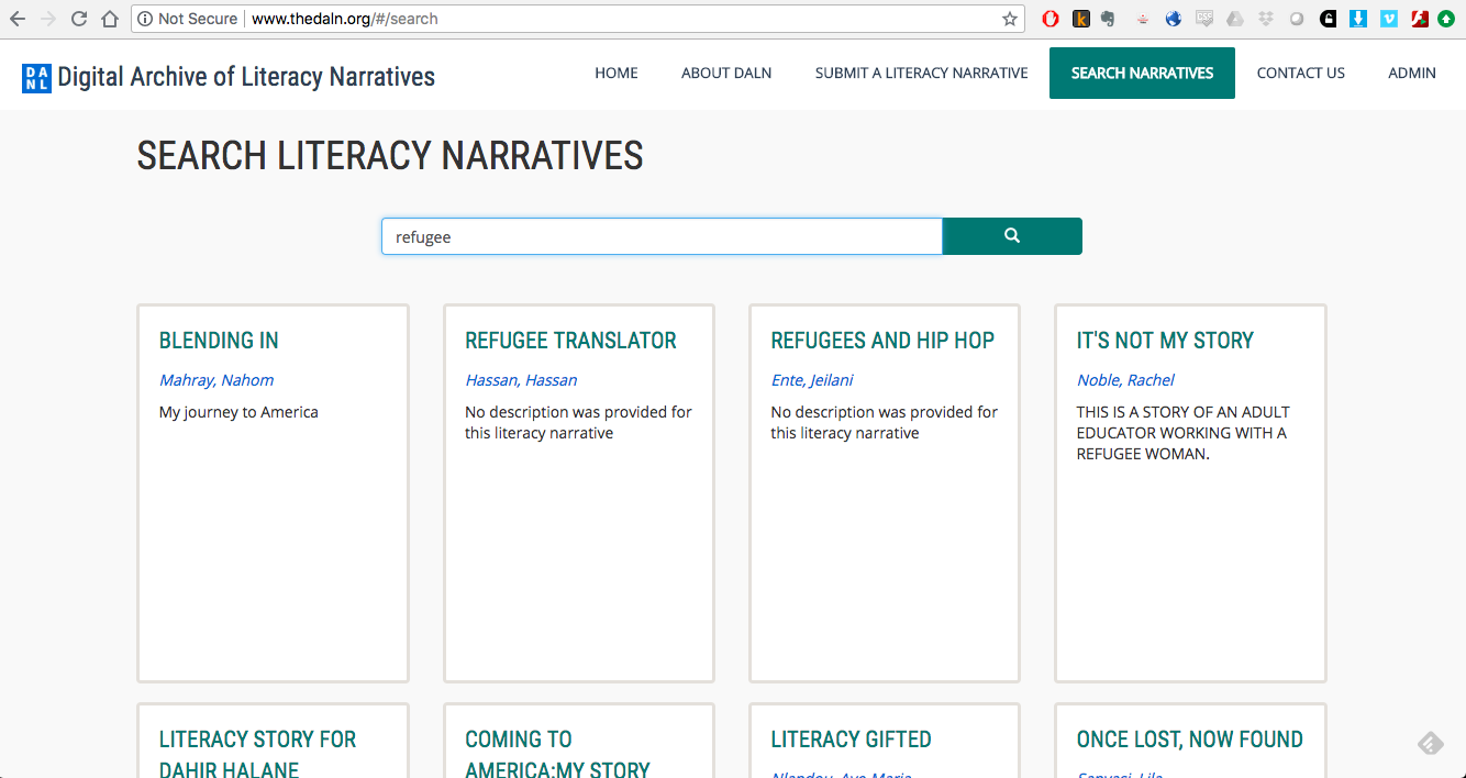 For refugees, learning to construct their own representation and tell their own story with tools of the dominant discourses of power disrupts the political hegemony silencing refugee voices that might challenge the “international order of things” (Sigona, 2016, p. 372). As political objects in the international world order/international humanitarian regime, refugees naturally must construct narratives and stories of violence, exile, oppression, and victimization to survive. Teaching refugees to recognize and value their own literacy practices, cultural values, and memories transgresses the prevailing “feminized and infantilized images of ‘pure’ victimhood and vulnerability” produced and reproduced in an endless stream of refugee representation in all forms of discourse—mass media, academic, and humanitarian (Sigona, 2016, p. 370). Alongside the mission of teaching refugees self-representation and communication skills is bringing these narratives and identities into public discourse. The archive, as a repository of public memory, permits refugees to act as researchers, scholars, and citizens as “they gain both the agency and the subjectivity to rethink history and their own relationship to it” (Norcia, 2008, p. 95). The contribution of my refugee students’ literacy narratives to the DALN creates a history in many cases where there are no archives at all. Refugees arrive in the U.S. with the clothes on their back, having abandoned their homes, schools, and communities—most often without diplomas, passports, birth certificates, or photographs. The DALN offers a space for refugee students who have crossed many borders, speak multiple languages, and share many cultures to create their own history (Hawisher, Selfe, Kisa, & Ahmed, 2010).